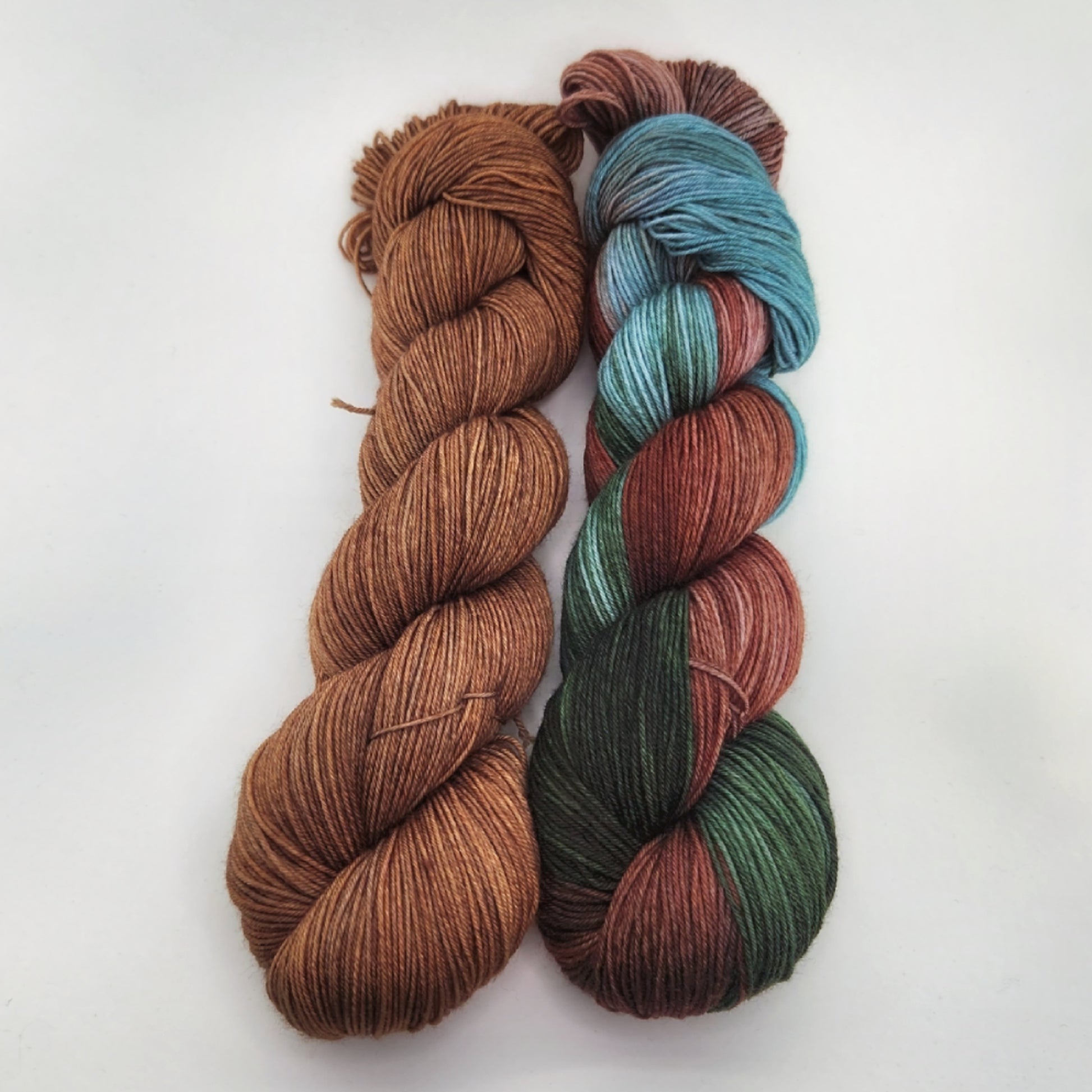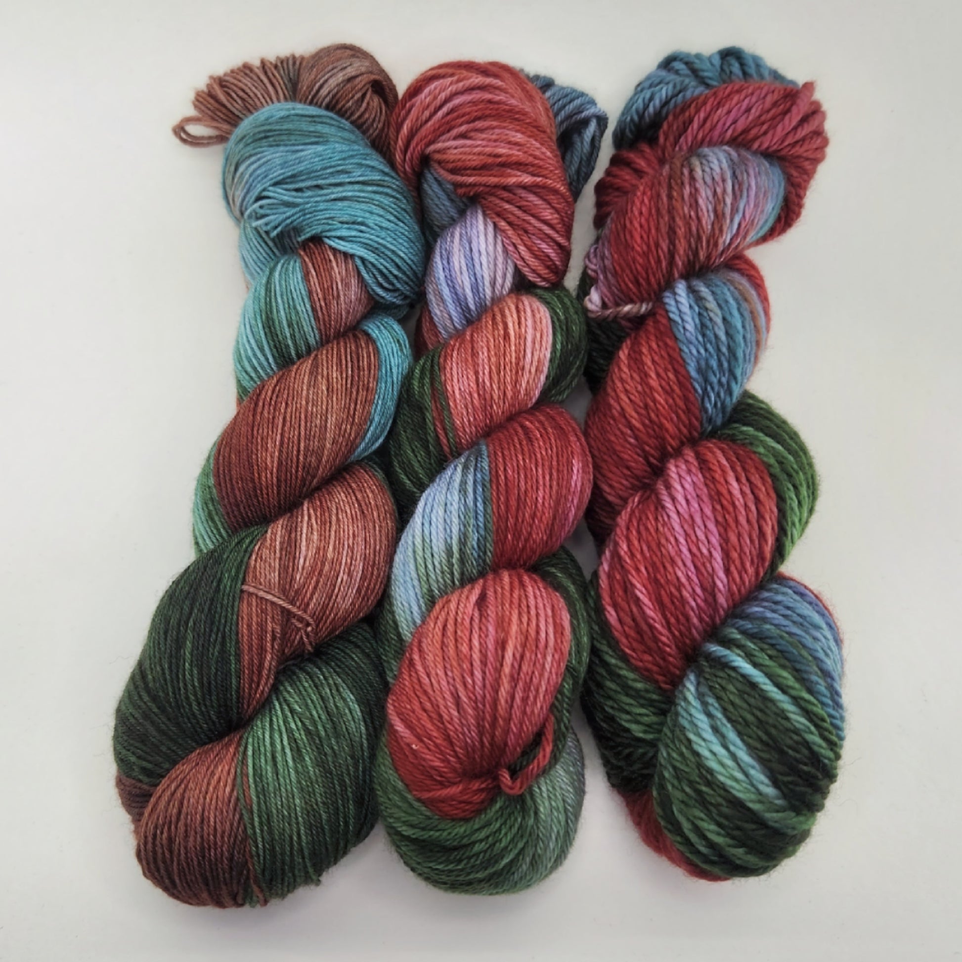 Photos on the product listings are examples of the colorway you will receive. I try to include different bases as the different fiber contents can take the dye differently. I use the same dye formulations when reproducing colorways, but due to the hand dyed nature and the difference in computer screens, the product you receive my look slightly different than the original photo. The appearance of the colorway and the saturation may differ from time to time, which adds to the uniqueness of the yarn. Multiple skein orders will always be dyed together to help ensure consistency within ordered colorways.