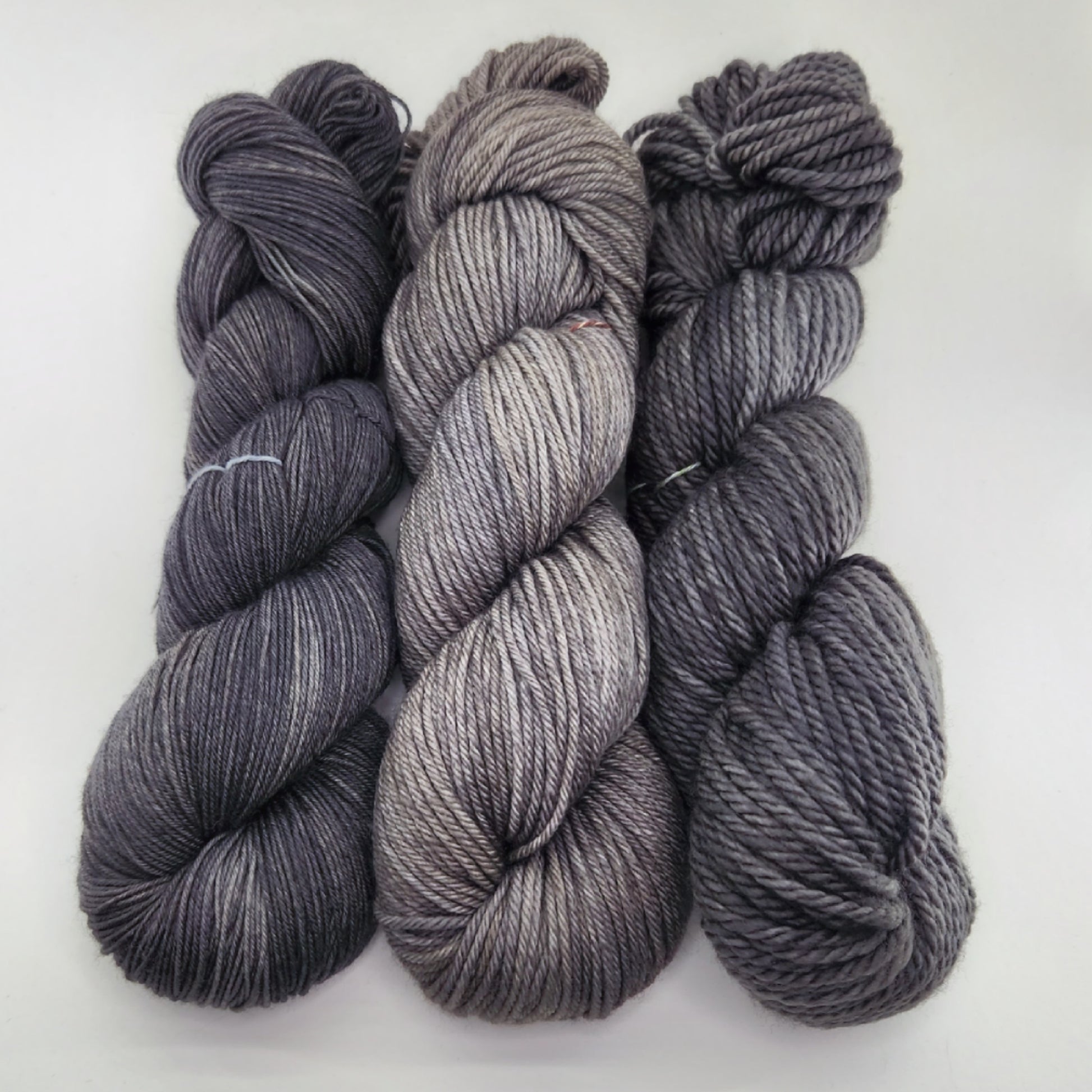 A semi-solid colorway with shades of grey and shadowed areas of black. A yarn with continuous changes of color and depth reminiscent of volcanic rocks.