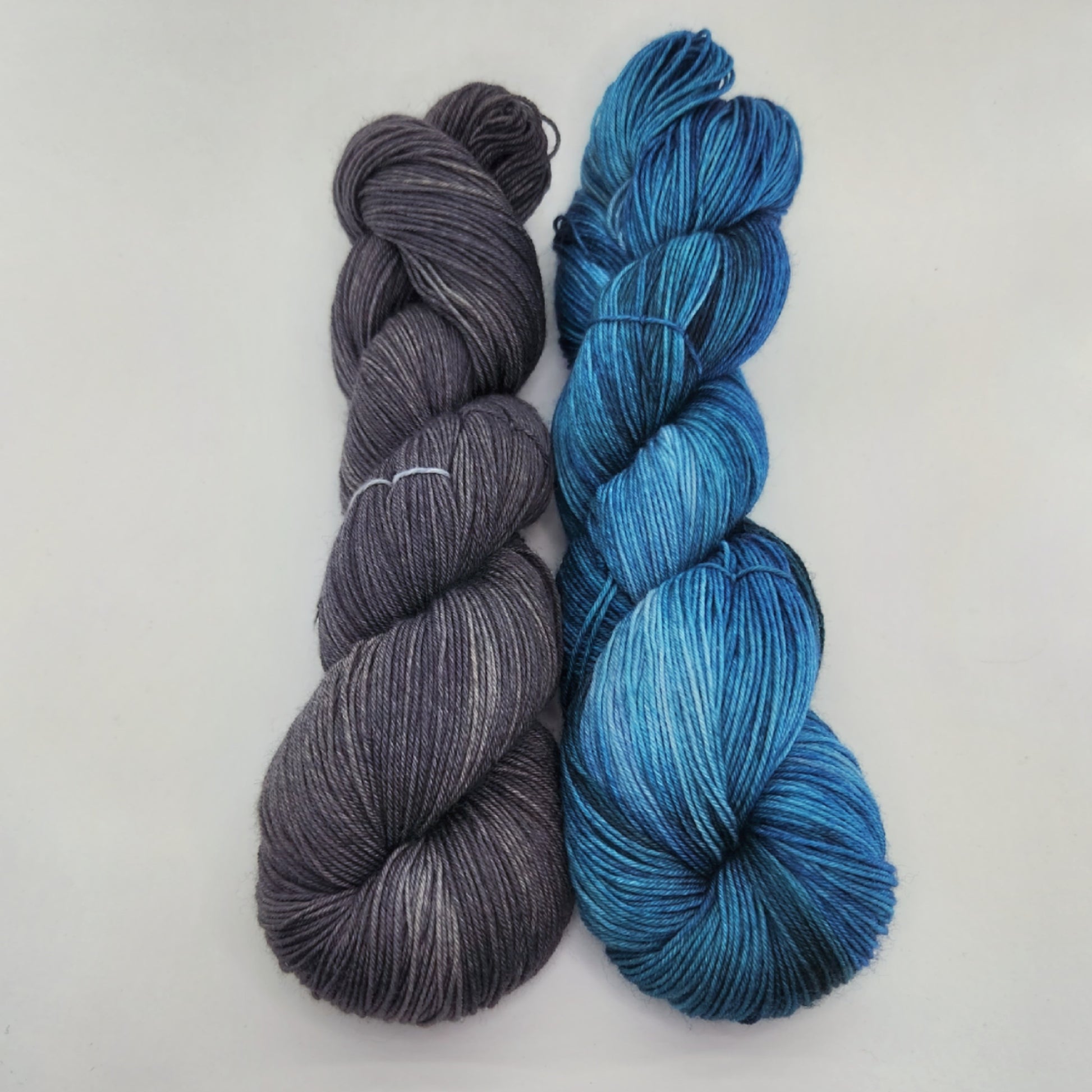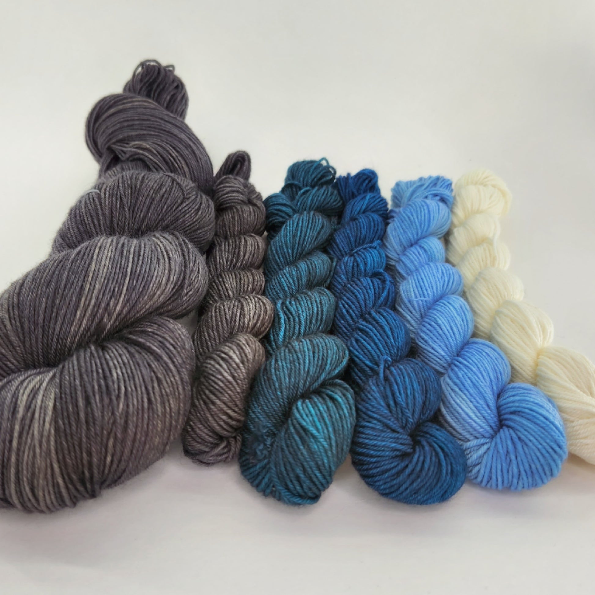 The Oregon Coast, a colorful palette pulled from nature and colors found in the land, water, and sky. This colorway is inspired by the deep waters of the Pacific Ocean, with semi-solid, variegated, and mini skein sets of coordinating colors.