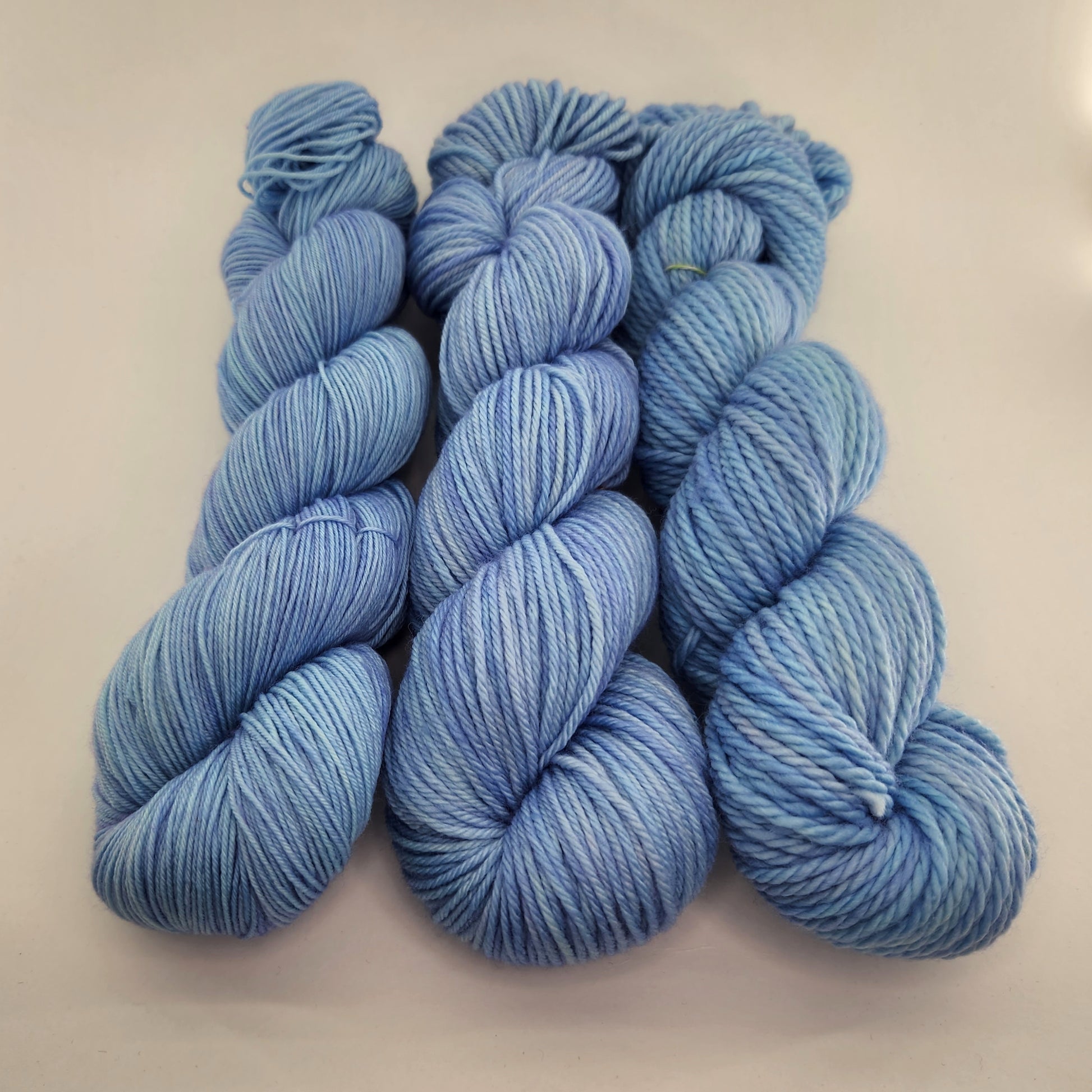 A semi-solid colorway with shades of pale blue and shadowed areas of soft violet. A yarn with continuous changes of color and depth reminiscent of ocean.