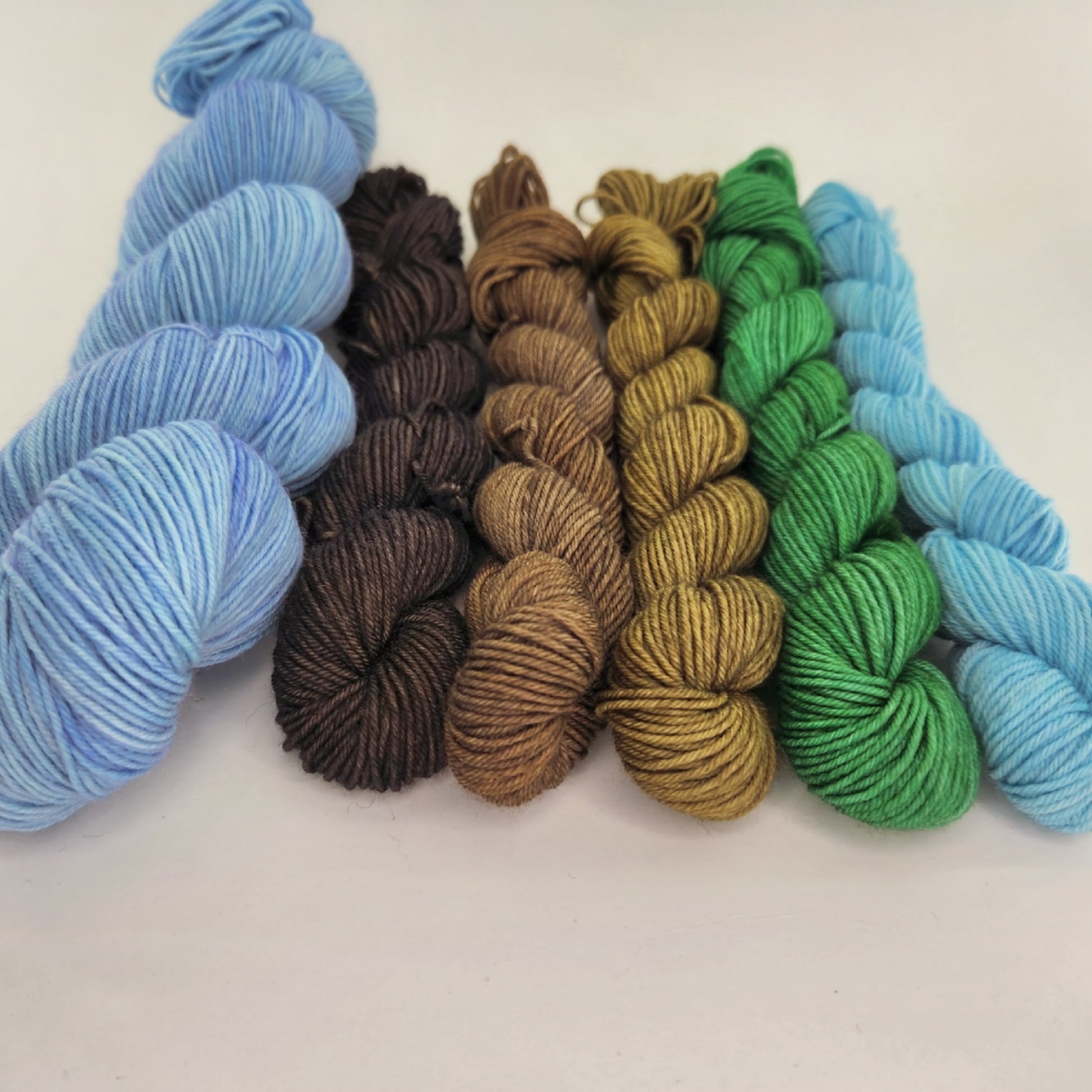The Oregon Coast, a colorful palette pulled from nature and colors found in the land, water, and sky. This colorway is inspired by the ocean crashing into the rocky shore, with semi-solid, variegated, and mini skein sets of coordinating colors.